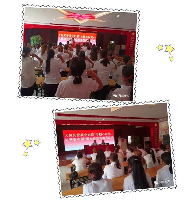 温宿县温宿镇以“巾帼心向党 礼赞新中国”主题道德讲堂形式,通过组织辖区妇女群众观看专题片、听主题宣讲,引导妇女群众表达爱国情怀,献礼新中国70周年华诞。
