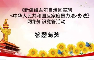 《新疆维吾尔自治区实施<中华人民共和国反家庭暴力法>办法》(以下简称《办法》)于2020年6月1日正式施行。为进一步加强宣传,增强全社会关心和维护妇女合法权益的法治观念,倡导良好家风,教育引导家庭成员互相关爱、和睦相处,以家庭平安促社会稳定。6月1日至10日,自治区妇联在“新疆女声”微信公众号举办《办法》知识竞答活动。这次知识竞答通过网络进行,参与方式简单,只要参加答题就有抽奖送话费机会。