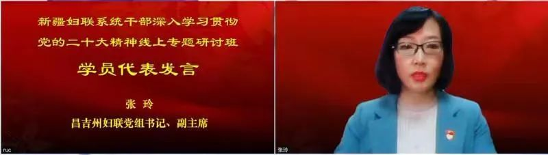 昌吉回族自治州妇联党组书记、副主席 张玲:我们将组织“巾帼大学习”,抓好“巾帼大宣讲”,聚焦“石榴花开耀天山”工程,最大限度把全州各族妇女的智慧和力量凝聚到建设美好新疆的宏伟蓝图上来,有效发挥桥梁纽带作用,在新时代新征程上坚定成为党开展妇女工作最可靠、最得力的助手。聚焦精准发力,纵深推进妇联组织改革,真正做到妇女在哪里,妇联组织和妇联工作就延伸到哪里,为党的事业凝聚妇女人心,当好妇女信得过、靠得住、离不开的“娘家人”。