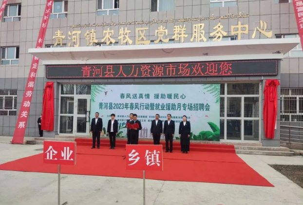 阿勒泰地区青河县妇联联合人社局、总工会、退役军人事务局等部门2023年春风行动暨就业援助月专场招聘会。