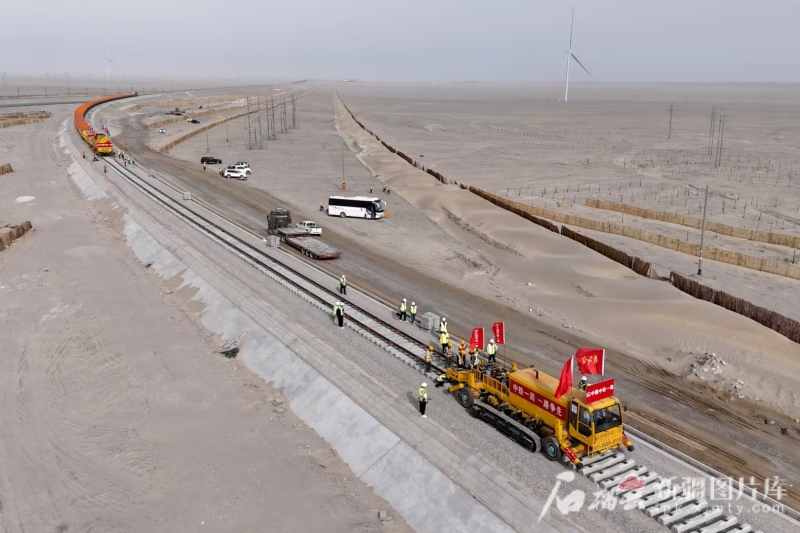 罗若铁路米兰至罗布泊铺轨现场,长铺机组在铺设长轨。赵树明 摄